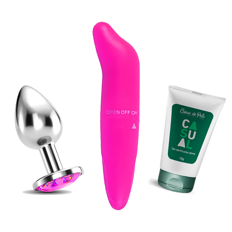 Kit contém: 1 Plug Anal em Aço com Jóia tamanho P + 1 Vibrador Ponto G + 1 Gel Lubrificante Casual 10g.