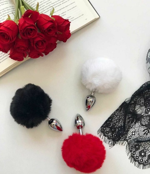 Plug anal em alumínio, pequeno com pompom, diversas cores.