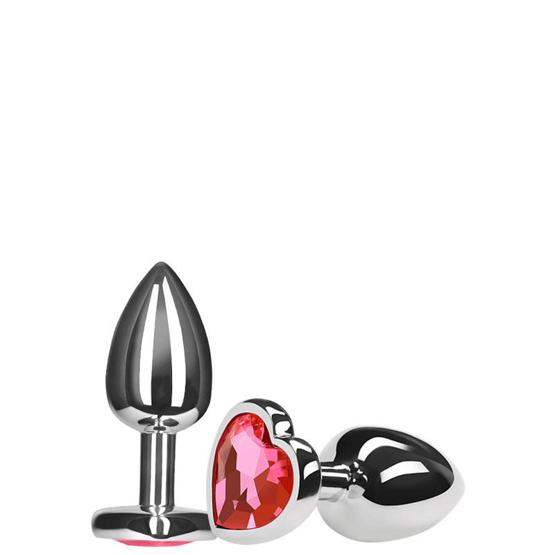 Plug anal em alumínio, pequeno, com aplicação de uma pedra colorida em sua base, formato coração.